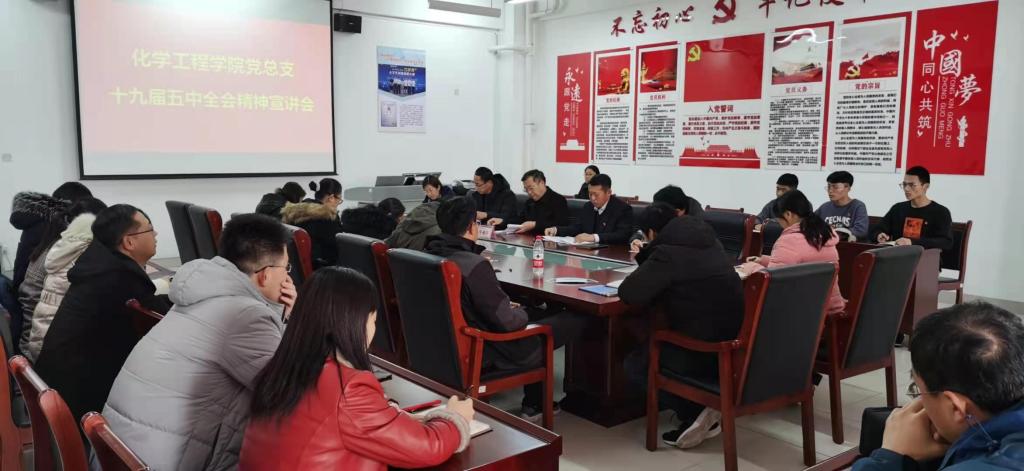 根据《中共yl88858永利中国委员会关于学习贯彻党的十九届五中全会精神实施方案》要求,按照学院党委统一安排部署,12月10日,yl8858永利集团党总支学习贯彻十九届五中全会精神宣讲会在木泽楼B207会议室举行,学院党的十九届五中全会精神宣讲团成员,学院党委委员办公室主任任培华到会宣讲,会议由化工学院党总支书记主持,教师党支部,学生党支部全体党员参加。