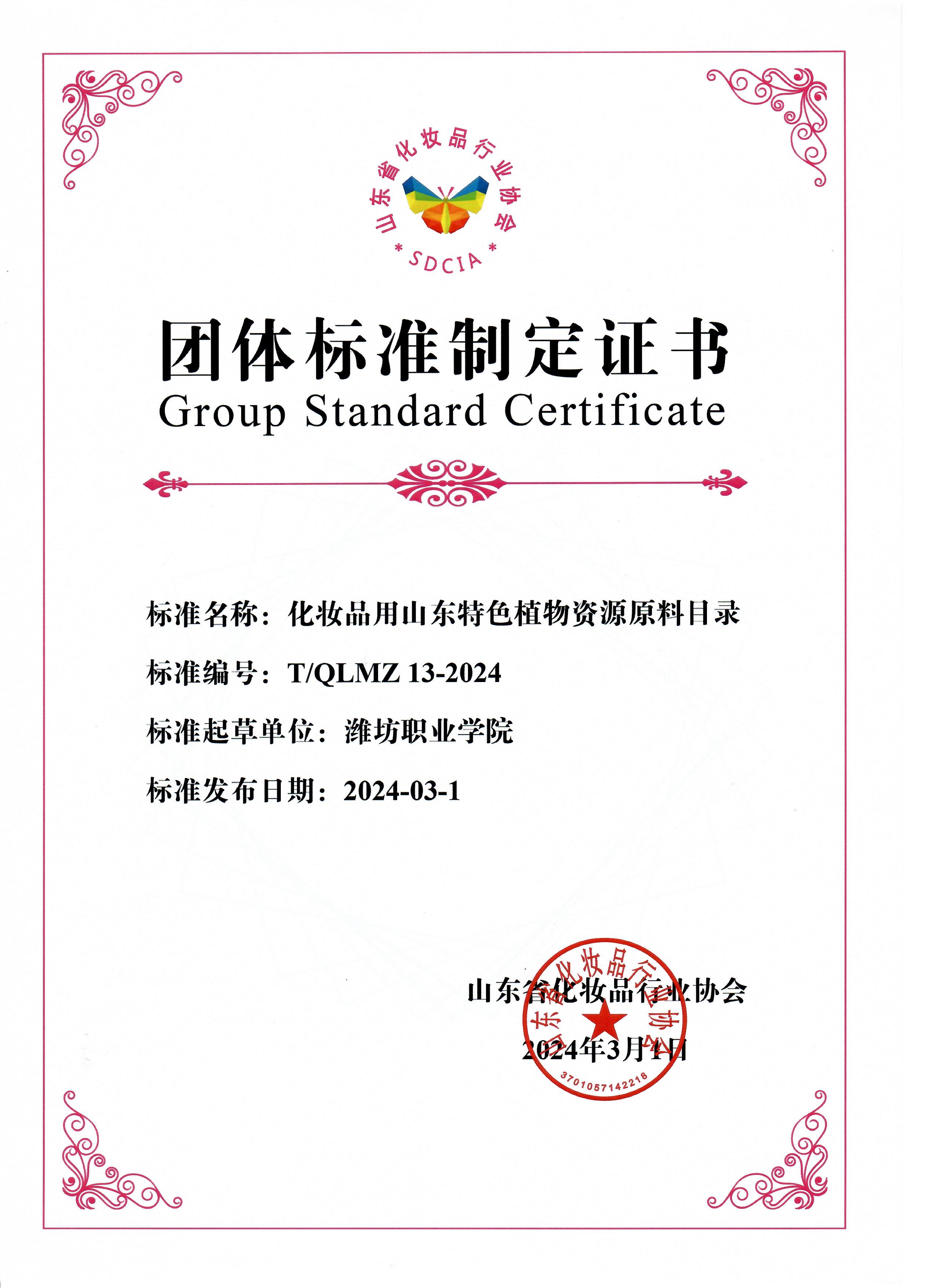 近日,我院化妆品技术专业专任教师参与起草的《化妆品用山东特色植物资源原料》、《化妆品用原料羟丙基四氢吡喃三醇》2项团体标准正式实施。自2021年以来,国内化妆品用原料不断涌现,消费者对新原料的接受程度逐步提高,但市场上缺少明确的规范参考。为规范国内化妆品原料市场和充分利用具有山东省地域特色的植物原料,我院化妆品技术专业刘苏亭、王萌等老师与山东省福瑞达生物股份有限公司等公司合作起草2项团体标准,对山东省特色植物原料的定义、分类、使用规范以及羟丙基四氢吡喃三醇的术语、定义以及活性物分类和使用规范制定了相应规范,对国内化妆品原料的健康发展提供帮助。