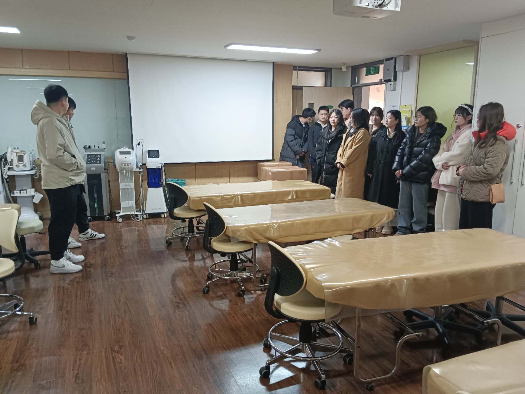 目前,8名中韩合作学生已顺利抵达韩国建阳大学,正式开启留学生涯。韩国建阳大学为赴韩学生设计了内容丰富、形式多样的学习内容,并带领学生参观了教室、实训室、宿舍等场所,同时安排中国留学生对口帮扶,帮助学生尽快适应留学生活。(王萌供稿)