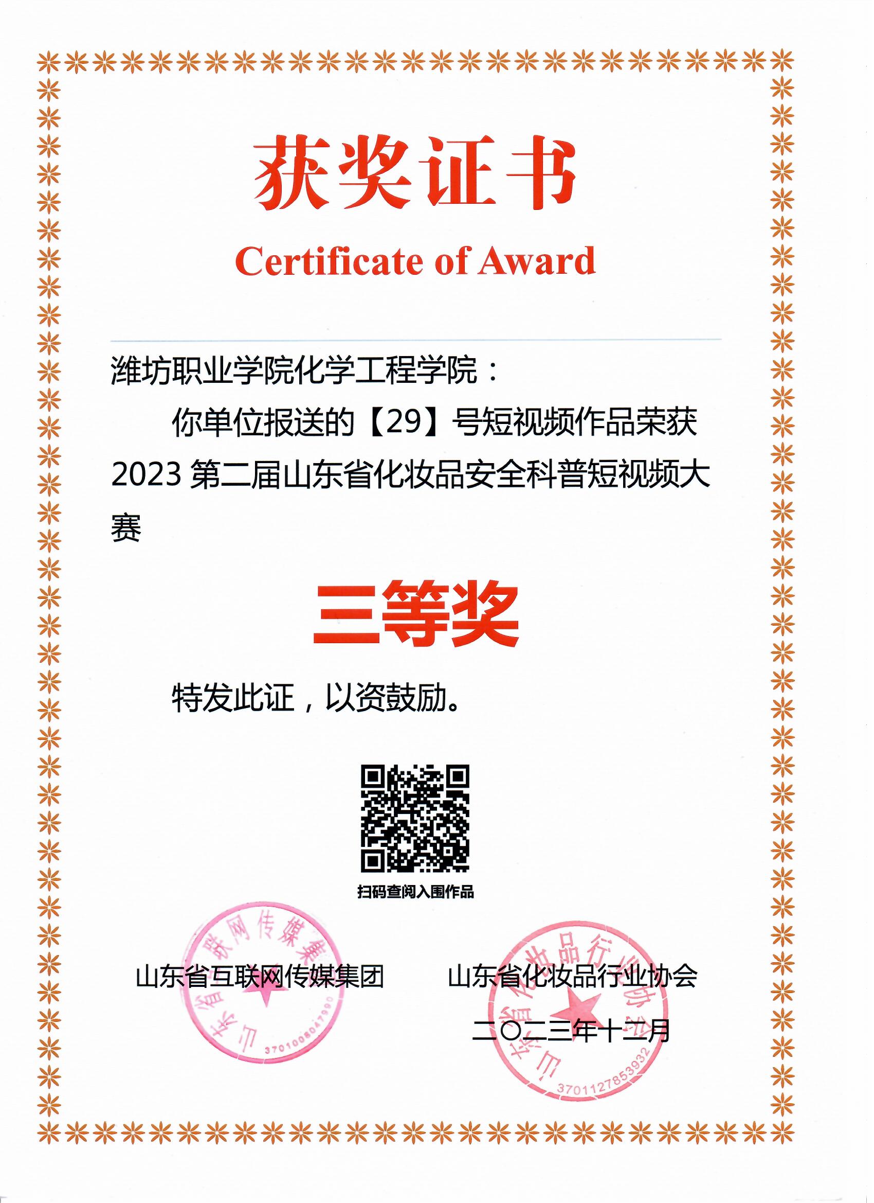 3月1日,由山东省药品监督管理局指导、山东省互联网传媒集团、山东省化妆品行业协会主办的2024年山东省化妆品产业高质量发展大会在济南举行。大会对第二届全省化妆品安全科普短视频大赛作品进行表彰。我院学生获三等奖1人,并被授予“山东省化妆品行业协会(第一批)职业技能培训基地”。