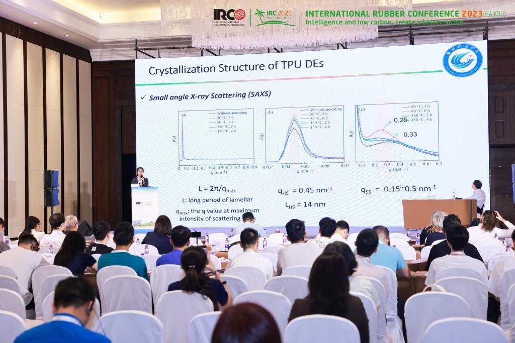 大会设置4个分会场,共9个专题,内容涵盖橡胶材料计算模拟与分析表征、橡胶/弹性体设计合成与化学改性、非石油基橡胶制备与应用、橡胶流变、加工新技术及装备、橡胶材料与环境、功能/智能/仿生橡胶材料、橡胶增强材料与助剂及绿色化、橡胶制品数字化设计与智能制造等。yl8858永利集团教师代表刘苏亭参加了本次国际橡胶会议,并作题为《Preparation of dielectric elastomers by tailoring the aggregation structure of polyurethane》的口头报告,她以介电弹性体的微观结构-功能特性为主要内容,介绍了通过调控热塑性聚氨酯的聚集态结构提高其电驱动特性,并对热塑性聚氨酯类介电弹性体材料的研发进行了展望。会议期间,刘苏亭与各位专家进行了热烈的咨询与交流。