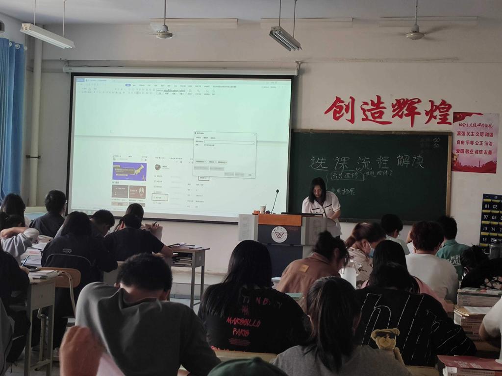 首先,负责老师首先解读了各专业人才培养方案,对选修课程的学科要点、学分要求等内容进行详细介绍,告诉同学们一定要对比自己的培养方案与成绩单上的学分修读情况,认真严谨地完成选课事宜。然后,老师们对选课流程进行了深度解读,并对选课时间、注意事项做出了强调,提醒同学们可以提前了解一些课程的信息,以便于筛选一下适合自己的课程;同时,对选课系统操作进行演示,帮助同学明确具体选课方法,促使同学们能有效及时地完成选修。最后,老师们对学生们存在的疑问的进行一一解答,再次提醒同学们一定要本着为自己高度负责的态度,根据自身情况,正确合理地进行选课,并按时上课,认真考试,及时查看成绩,获取学分,以顺利毕业。