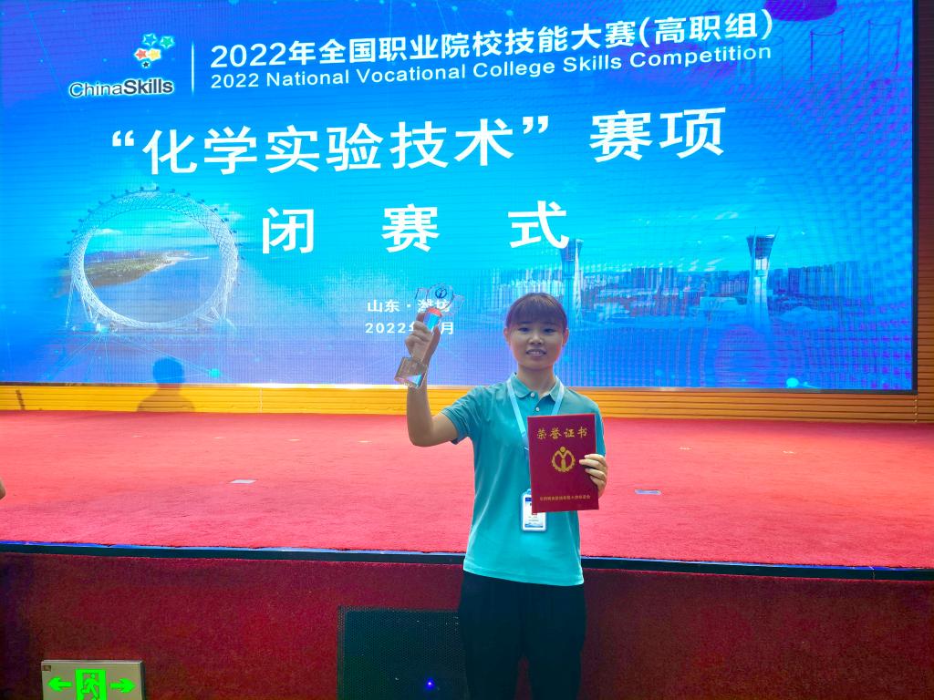 8月14-17日,2022年全国职业院校技能大赛高职组“化学实验技术”赛项在我院举行,来自全国各省(自治州、直辖市)的56支参赛队同台竞技。经过激烈比拼,yl8858永利集团刘玉婷同学凭借扎实的技能操作功底与良好的职业素养,沉着应对,最终斩获大赛一等奖第一名的好成绩。指导教师李雪贞荣获“优秀指导教师”称号。