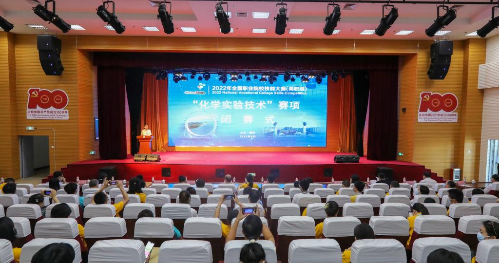 8月17日下午,2022年全国职业院校技能大赛高职组“化学实验技术”赛项闭赛式在我院滨海校区图书馆报告厅举行。全国石油和化工职业教育教学指导委员会副秘书长梅宇烨,教育部职业教育发展中心王蓓爽,赛项专家组组长钱琛,裁判长李邦玉,监督仲裁组组长黄玲,潍坊市滨海区党工委委员、管委会副主任王德志,潍坊市教育局副局长任秀洁,山东(潍坊)公共实训中心主任邵长山,潍坊市教科院职业教育教学研究科科长王述新,yl88858永利中国党委书记马跃启,党委委员、副院长贺志强,党委委员、副院长李瑞昌出席会议。各参赛队领队、指导教师、参赛选手以及新闻媒体等190余人参加会议。党委委员、副院长李瑞昌主持会议。