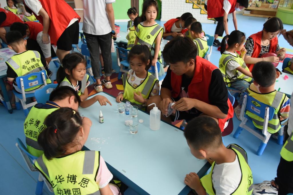 7月9号上午,yl8858永利集团“筑梦化学”暑期社会实践团队走进潍坊市高新区新城街道世华博思幼稚园,大学生与小朋友手拉手做趣味物理、化学小实验。我院大学生首先给幼儿园小朋友讲解了试验的小视频,让孩子们有了直观的了解。随后,小朋友们分组,一个小组由大学生与小朋友们面对面做气球转转圈、密度与扩散、隐形字的写法等趣味物理、化学小实验,期间小朋友们积极与大学生互动,提出了很多有趣的问题。此次活动对启发小朋友的科学思维有一定的帮助。下午,社会实践团队走进潍坊市经济开发区张氏街道万和社区,给普通老百姓宣讲生活中的化学等科普知识,与社区的小学生们一起做趣味物理、化学小实验,受到了小区居民的称赞,宣传了学校。