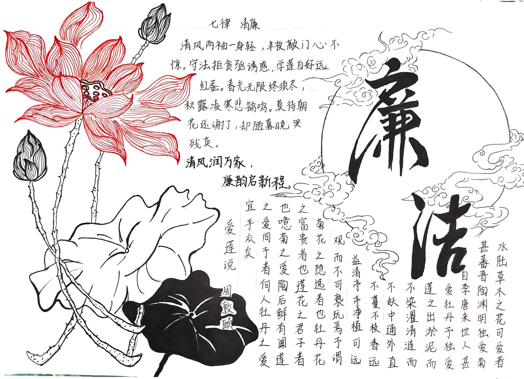 活动自启动以来,得到了同学们的积极响应与广泛参与。同学们围绕廉洁主题,精心设计版面,巧妙构思内容,用一幅幅图文并茂、色彩鲜艳的手抄报作品,生动展现了廉洁自律的重要性,以及它在日常生活和学习中的具体体现。这些作品不仅涵盖了党纪法规、廉洁自律准则等基础知识,还融入了古今中外廉洁典范的故事,以及个人对廉洁文化的理解和感悟,内容丰富,形式多样,充分展示了同学们的艺术才华和创新能力。