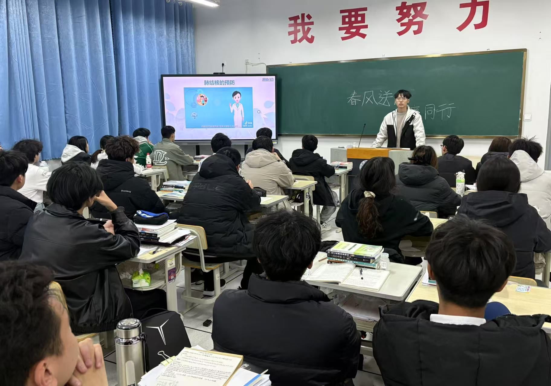 团课过程中,各班级团支书首先围绕流感、诺如病毒、结核病等常见疾病,结合近期班级同学的健康状况,分析了春季传染病的传播特点。随后,重点介绍了传染病的预防措施,包括保持室内通风、定期消杀、养成良好卫生习惯、加强体育锻炼等,并科普了“七步洗手法”“科学佩戴口罩”等实用防护技巧,强调了“防胜于治”的理念。最后,团支书呼吁同学们从日常生活中的细节做起,增强自身免疫力,降低感染风险。