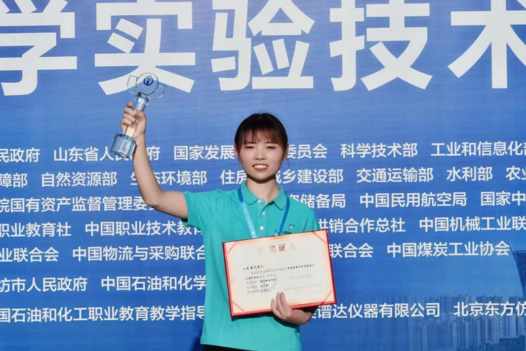 春夏秋冬、寒来暑往,漫长的训练枯燥而单调。一遍又一遍、重复再重复,每天的训练时间长达11个小时,汗水浸透了衣服,但她始终充满乐观,几乎每天都沉浸在实验室里,忘我训练,直至夜晚校园空无一人,从不叫苦叫累、懈怠气馁。2020年的11月份她迎来了自己的第一次大型比赛(山东省职业院校技能大赛“化学实验技术”竞赛项目),经过几天的激烈斗争,最终获得省赛二等奖。她心有不甘,为了弥补遗憾,她选择留校继续参加第二年的省赛,在此期间有过失落、担忧,但她会及时调整,指导教师也会第一时间做好心理疏导,调整训练方案,保证她心态的积极性。