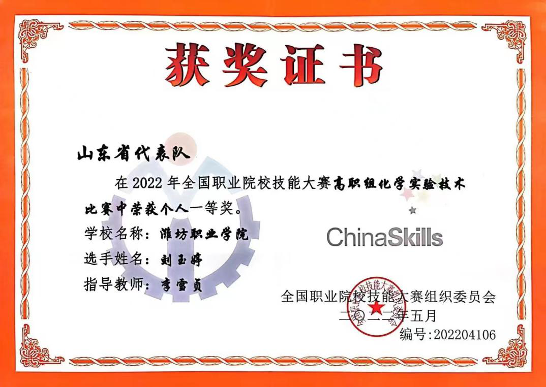 2021年开启了她竞赛的第二个年头,从7月到11月,从夏天到秋天,从“单薄”到“厚实”。她开始深入研究赛题,一点点的研究,一次次的推翻重试,那种无力感充斥着她,在这种重复打压下她早已学会了自我调整,于是她改变了传统方法,转变了思维,功夫不负有心人,在无数次的实验中,产率和纯度都达到了一定的高度。紧接着,她迎来了第二次比赛(第十三届山东省科技节“工业分析与检验”竞赛项目),这次获得了个人一等奖及团体一等奖,五天的威海之行让她受益颇丰,对手基本上是即将参加省赛的选手,大家的实力都不容小觑,因此也有了一定的压力。很快11月份迎来了她第三次大型比赛(山东省职业院校技能大赛“化学实验技术”竞赛项目),这次准备的比较充分,结果上都达到了她的预期,最终获省赛一等奖。