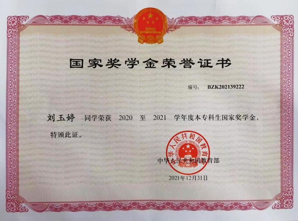 刘玉婷,中共预备党员,山东菏泽人,2021年国家奖学金获得者,yl88858永利中国2019级工业分析技术专业学生。自入校以来,她学习积极进取、刻苦努力,曾多次被学校评为“三好学生”“优秀学生干部”等荣誉称号,从班内一名普通学生,一步一步成长为全国职业院校技能大赛优秀选手。现就职于中国工程物理研究院材料研究所。