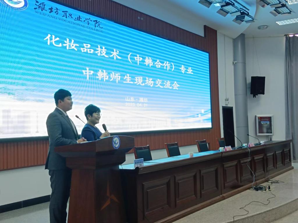 韩瑞东对客人的来访表示热烈欢迎,共同观看了学院宣传片,介绍了学院办学历史、发展现状及取得的主要成绩,并对两校合作举办的化妆品技术专业教育项目的顺利推进给予高度评价,期望两校共同努力把项目打造成中外合作办学标杆项目。卢永姬对学院的热情接待表示感谢,简要介绍了建阳大学的办学规模、国际合作等情况,并通过观看视频回顾了两校互访交流、共同办学的历程,向我院赠送了两校合作纪念牌。随后,双方就合作办学项目韩方授课安排、教师赴韩研修、学生专升本衔接等进行了深入探讨,以期推进项目的规范化、高质量发展。