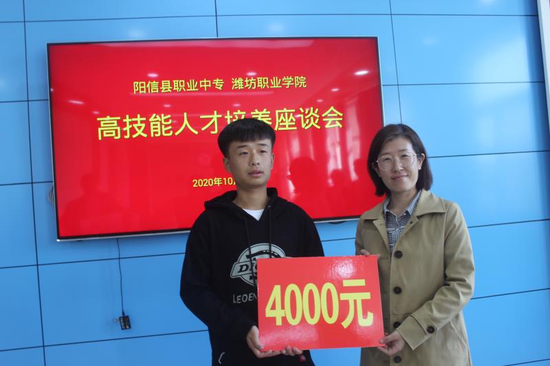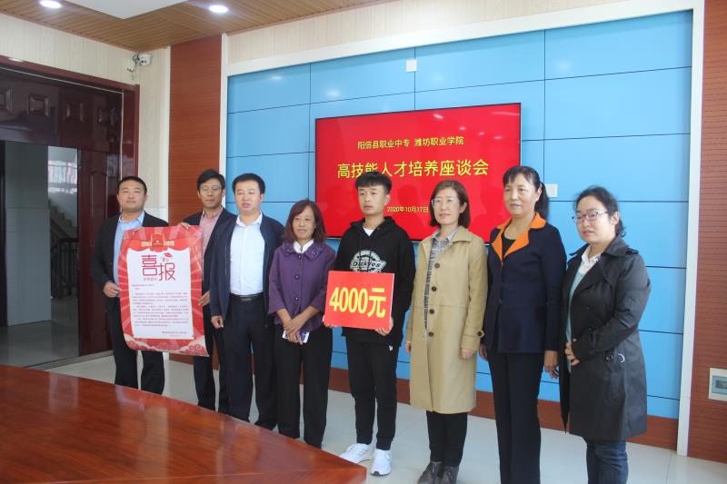 双方举行了座谈。阳信职业中专副校长阎汝强介绍了该校学生的生源情况、教师爱岗敬业的工作作风,特别指出该校学生对我院的认可度极高,感谢yl88858永利中国对阳信职业中专在教学资源共享方面给予的支持,希望依托名师工作室,能更好的细化优化中高职衔接培养中的具体工作,扩充三二连读人才培养计划,使更多的中职学生受益。我院yl8858永利集团教学负责人马天芳首先对阳信职业中专每年为我院输送高素质学生表示感谢,她指出,应用化工技术专业是国家骨干专业,非常注重人才培养质量的提升,将对高职阶段的三二连读学生实行个性化培养;同时,为了吸引优秀生源,我院出台了专门的奖励办法,对在全国职业院校技能大赛中获奖的同学在单招考试中实行免试入学政策,并根据获奖等次给予奖励。借我院新生入学之机,名师工作室专程为被我院2020年单招免试录取的优秀学生全国职业院校技能大赛二等奖获得者吕明辉同学送去喜报、颁发了优秀学生奖金,希望通过我们两校合力培养,学生能够成长为社会需要的高素质技能人才。