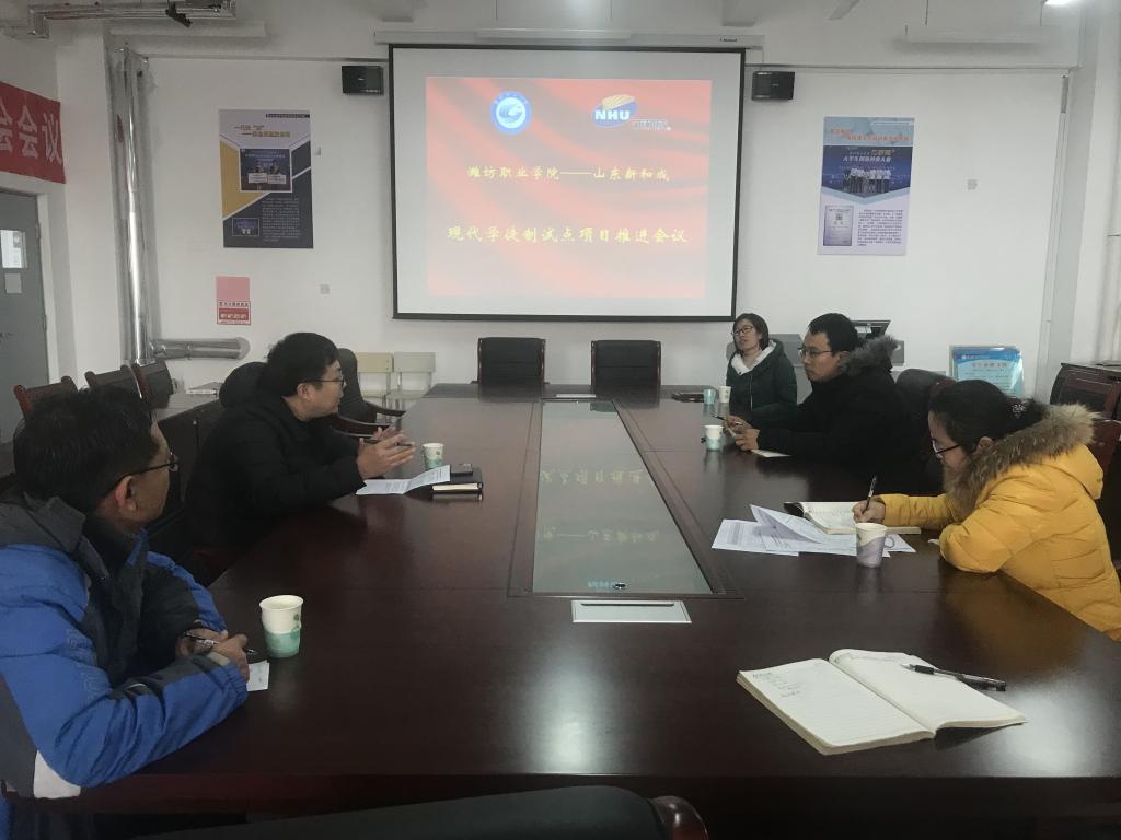 为深入推进现代学徒制试点项目建设,12月24日,yl8858永利集团分管领导、产学研办公室主任、化工创研室主任及部分骨干教师与山东新和成控股有限公司负责人在木泽楼B207会议室就2018级、2019级现代学徒制班合作培养相关工作进行了深度的洽谈交流。