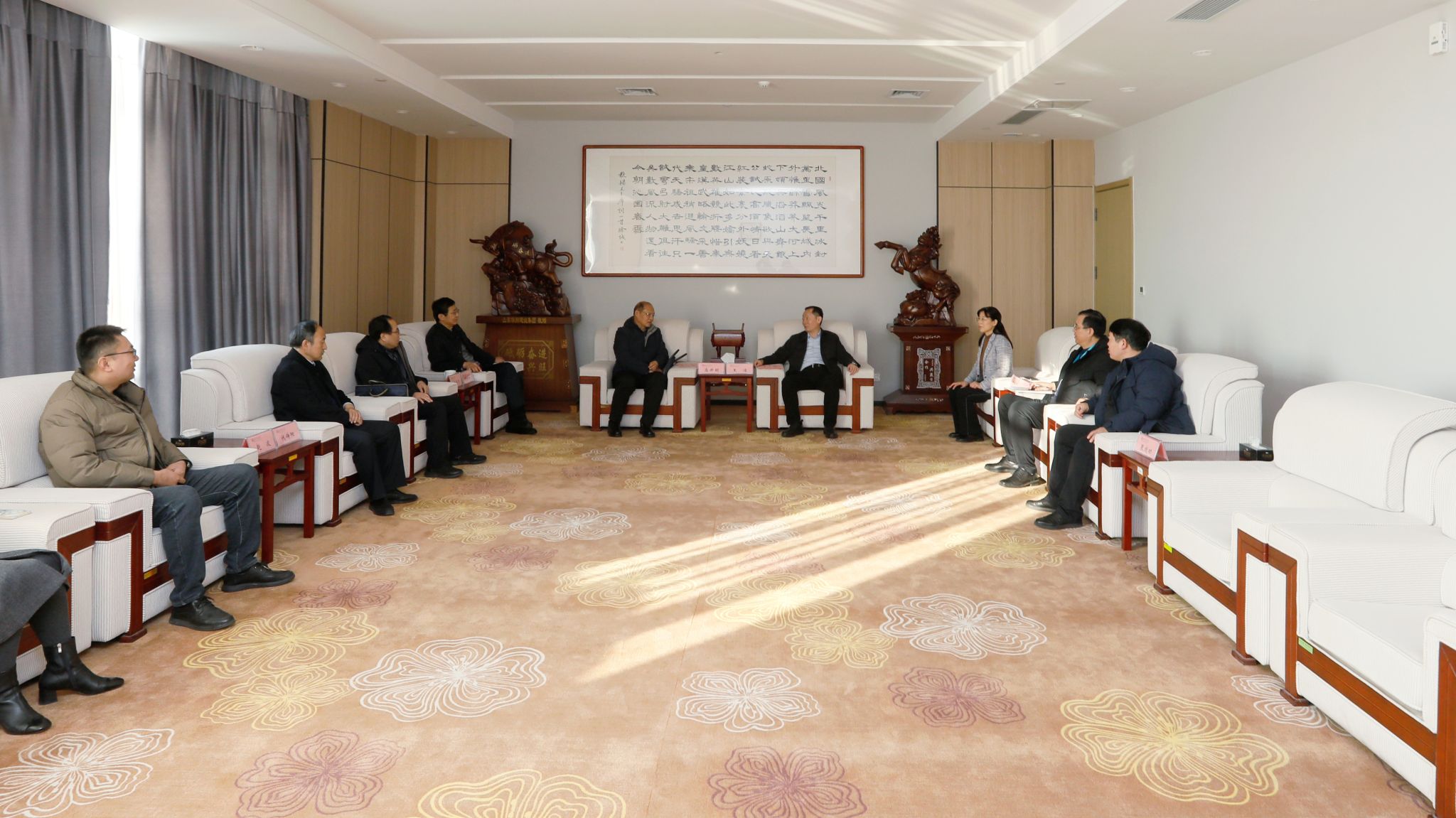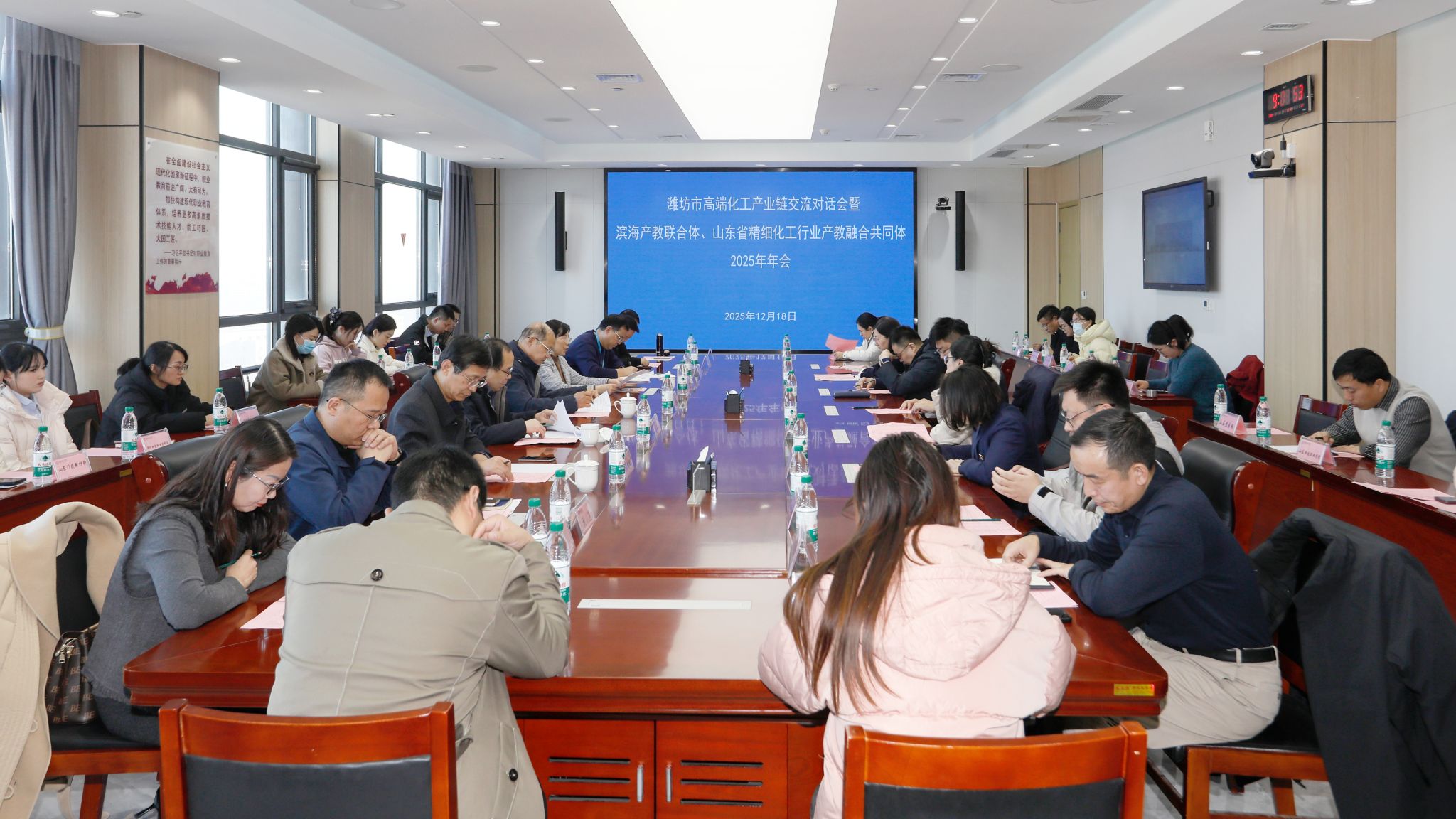 12月18日,潍坊市高端化工产业链交流对话会暨滨海产教联合体、山东省精细化工行业产教融合共同体2025年年会在yl88858永利中国滨海校区举行。学院党委书记王浩会见参会单位负责人。潍坊市产教融合研究院副院长马玉才,滨海经济技术开发区党政办公室二级专员高升明,山东(潍坊)海洋科技大学园管理办公室党组成员、副主任谭树田,学院副院长陈美霞,滨海区产教联合体、山东省精细化工行业产教融合共同体副理事长单位及成员单位代表,学院科技处(产学研合作中心)、yl8858永利集团负责同志和教师代表共计50余人参会。
