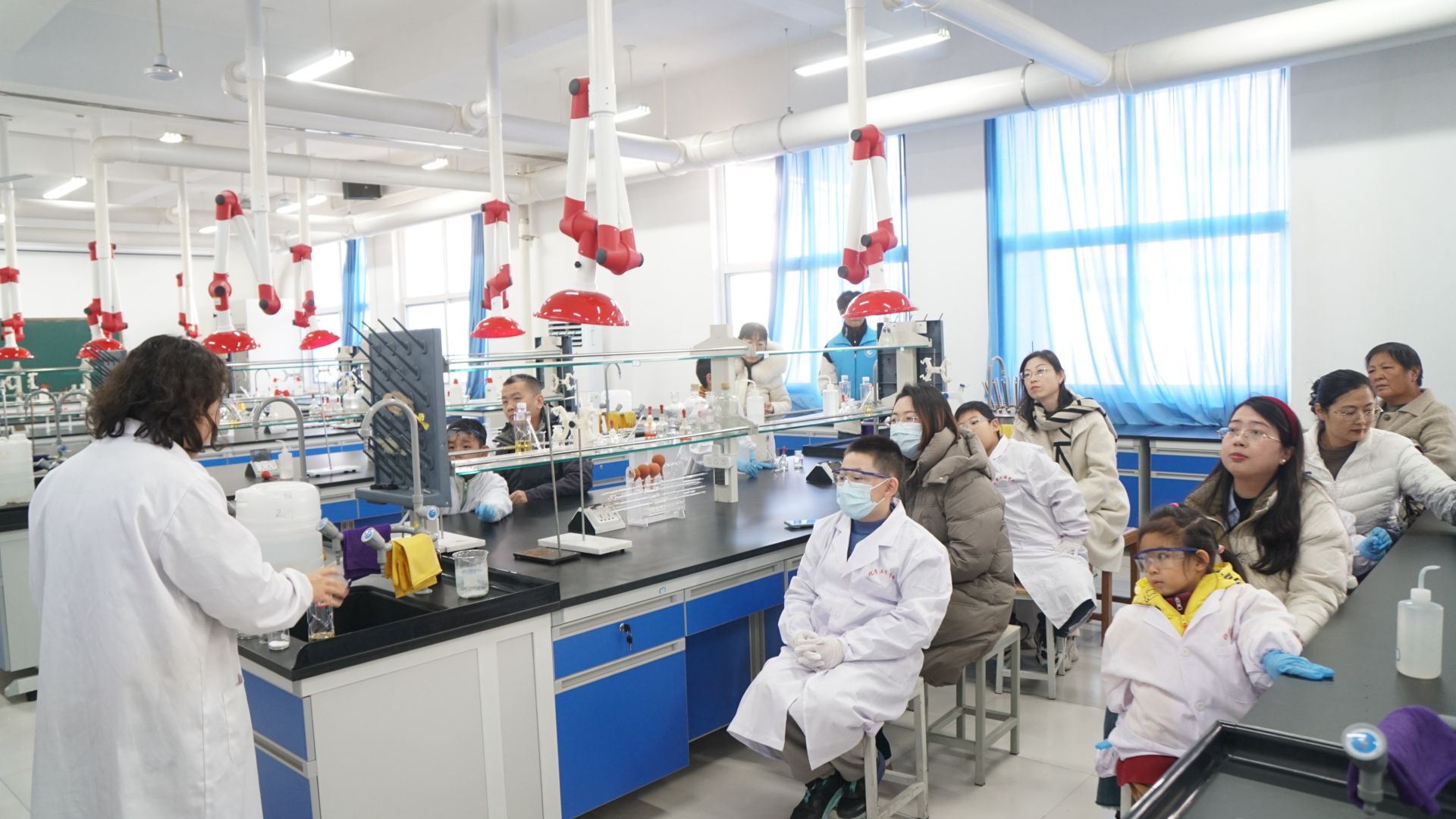 活动开始前,志愿者学生帮助小朋友们穿戴好实验服、防护眼镜、手套等个人防护用品。活动开始,授课教师首先详细讲解了实验用到的玻璃仪器、化学试剂的种类和使用方法等,小朋友们在老师的引导、家长的辅助下,动手操作了“火山喷发”小实验。如魔法般的实验现象深深吸引了小朋友们的注意力,激发了他们探索科学的好奇心。他们纷纷举手提问问题,授课教师深入浅出地解答了实验原理,现场气氛热烈。直至活动结束,仍有小朋友留在实验室,主动向授课教师请教化学实验仪器搭建知识等。